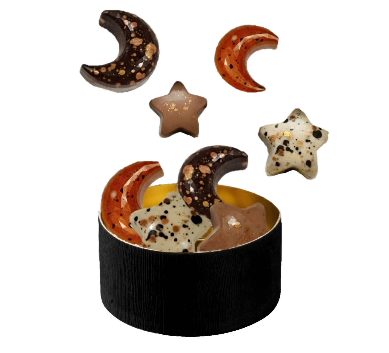 Ontdek de Moon & Star Chocolate Mix in luxe ronde geschenkdoos, een verfijnde selectie chocolade in de vorm van maantjes en sterretjes. Deze elegante bonbondoos met acht ambachtelijke bonbons is een stijlvol en halal cadeau voor Ramadan of Eid Mubarak, perfect om te delen tijdens iftar of om iemand feestelijk te verrassen.